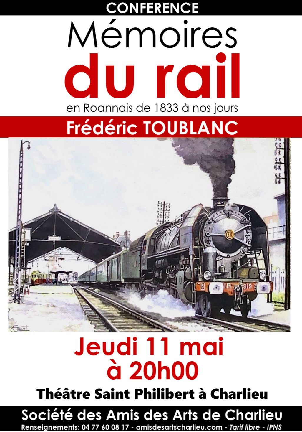 La Société des Amis des Arts de Charlieu est heureuse de vous convier à la conférence qui sera donnée le jeudi 11 mai à 20 heures au théâtre St-Philibert.Frédéric Toublanc, ancien professeur d’histoire-géographie, a déjà publié plusieurs ouvrages sur l’histoire ferroviaire de notre région.